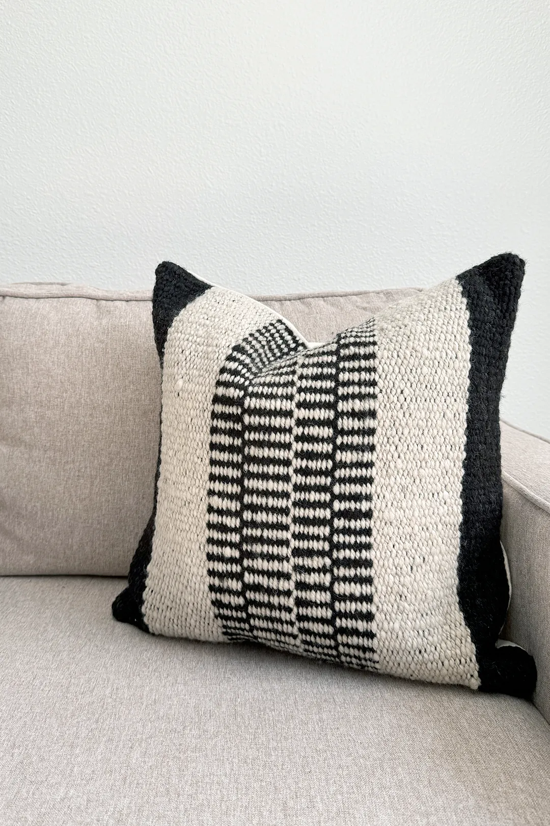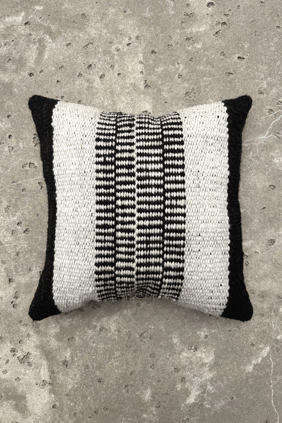 Design: A color block pattern in natural and natural black, with bold linear blocks that highlight the contrast and texture of the handwoven wool.