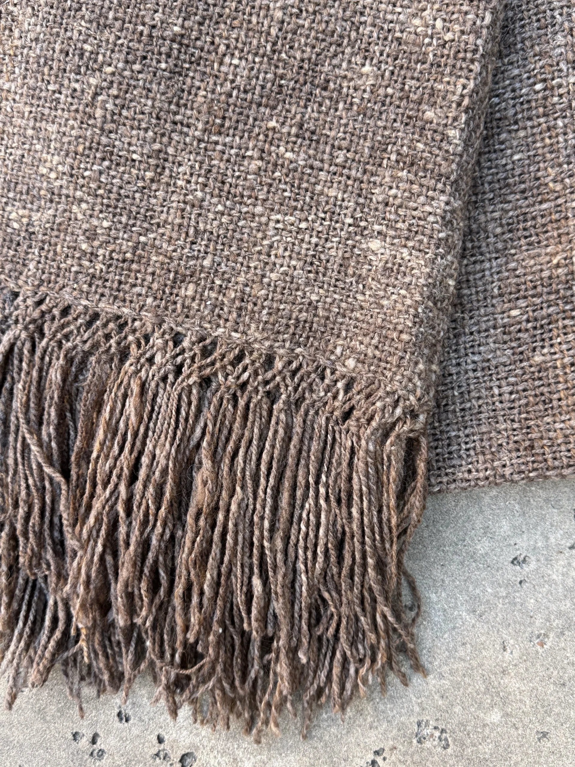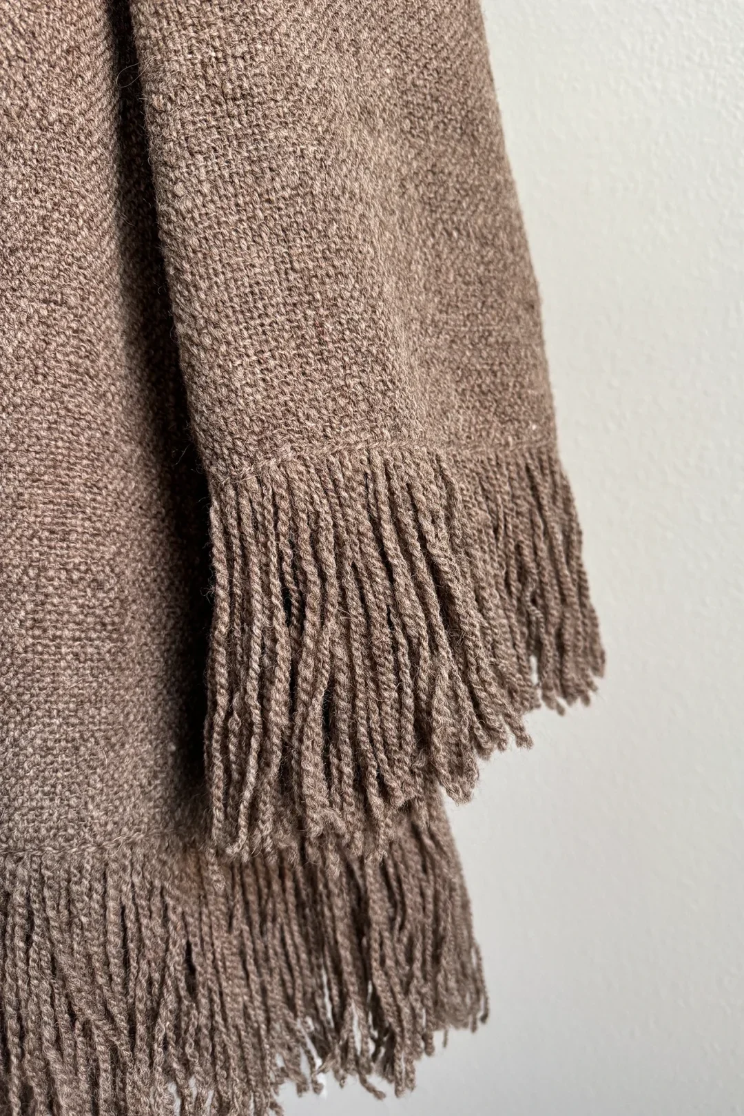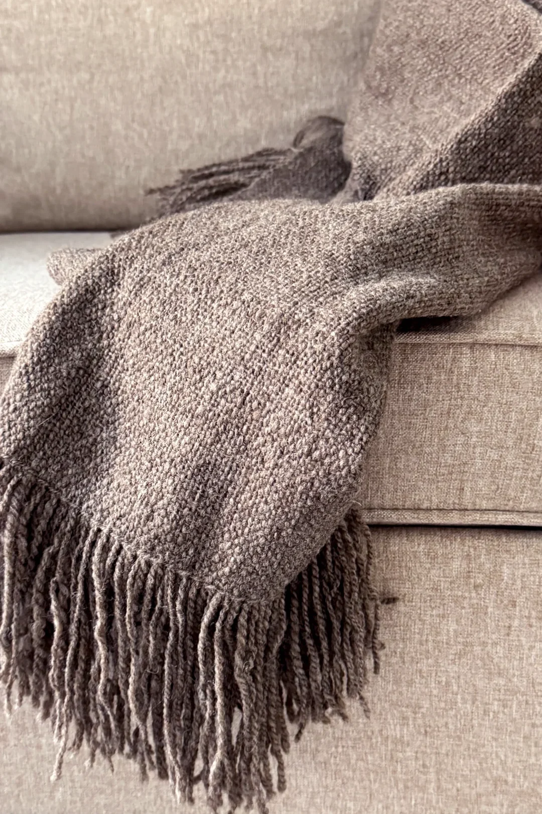 Its muted mushroom tone reveals the gentle variations of undyed wool, an honest expression of the fiber itself. Generous in size and comforting in weight, it adapts easily—draped over a chair, at the foot of a bed, or wrapped around the shoulders.